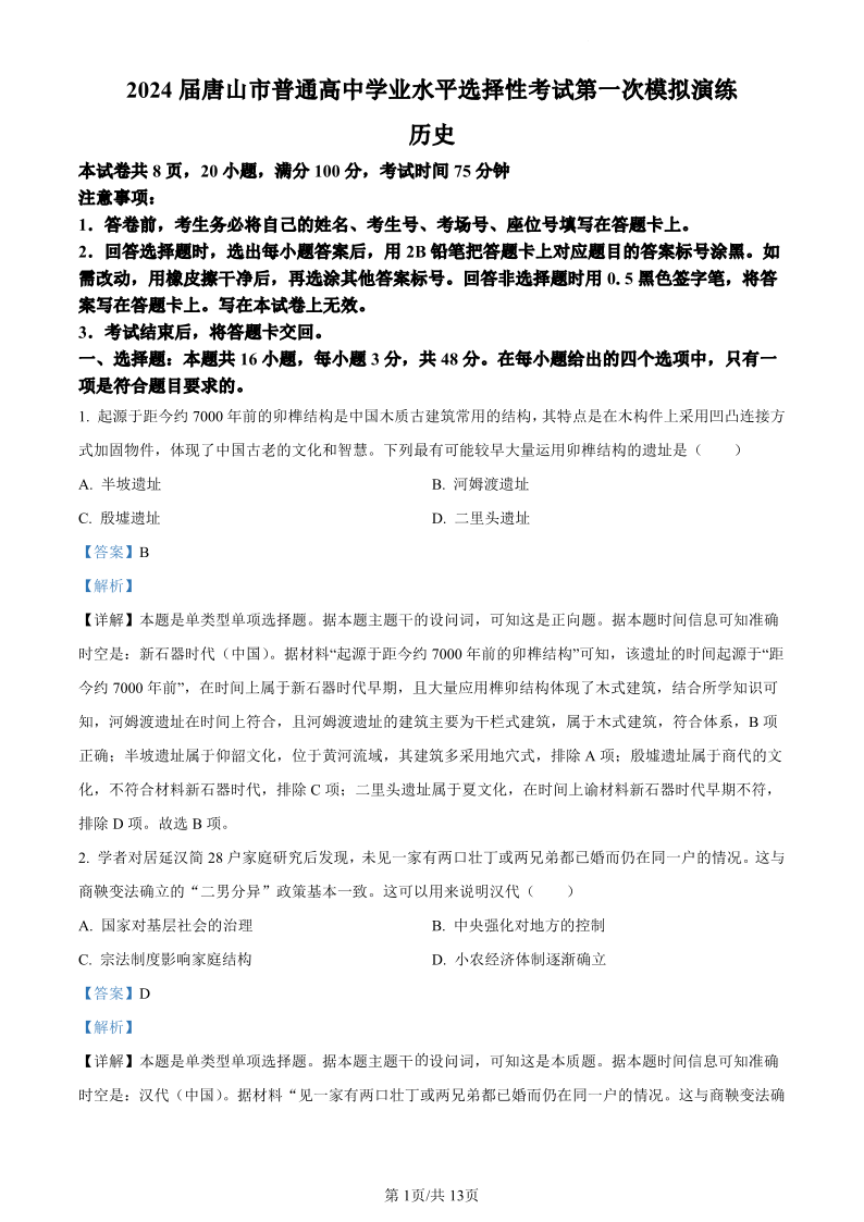 唐山市2024 届普通高中学业水平选择性考试第一次模拟演练(唐山一模)历史(解析版)