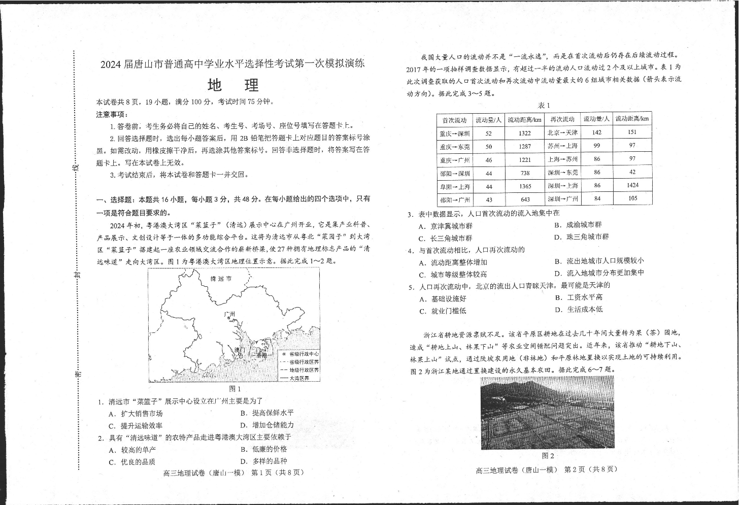 唐山市2024 届普通高中学业水平选择性考试第一次模拟演练(唐山一模)地理