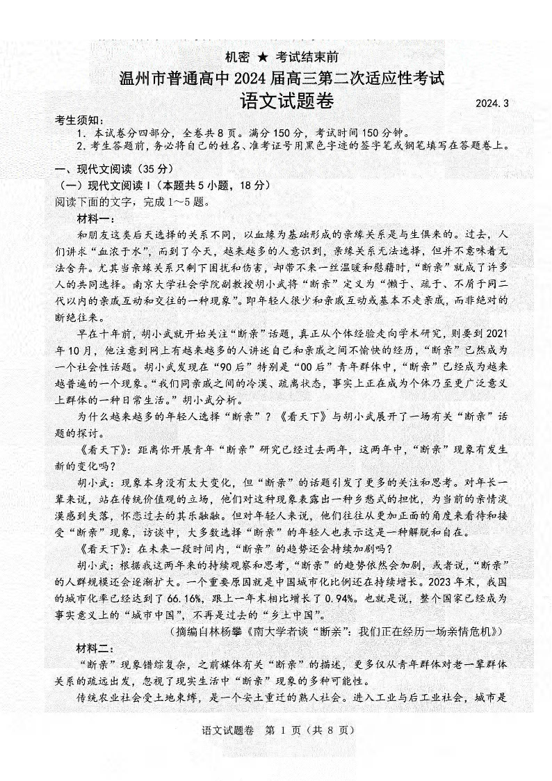浙江省温州市普通高中2024届高三第二次适应性考试(温州二模)语文