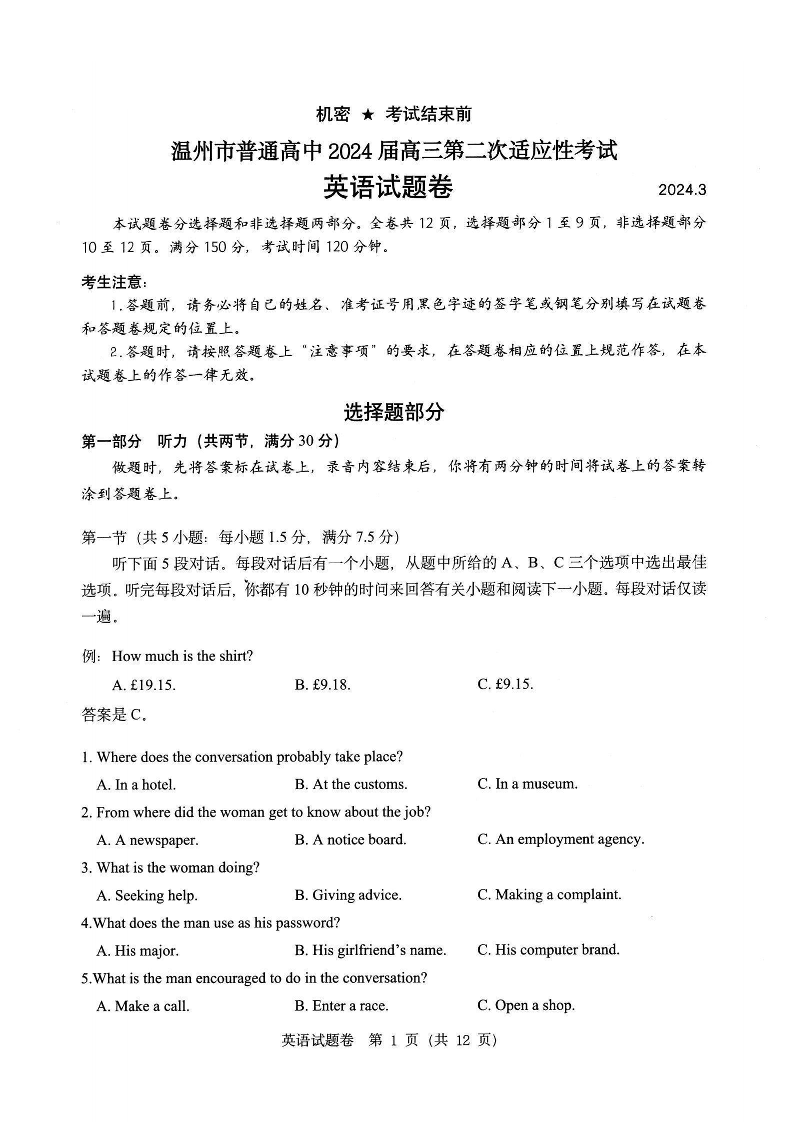 浙江省温州市普通高中2024届高三第二次适应性考试(温州二模)英语
