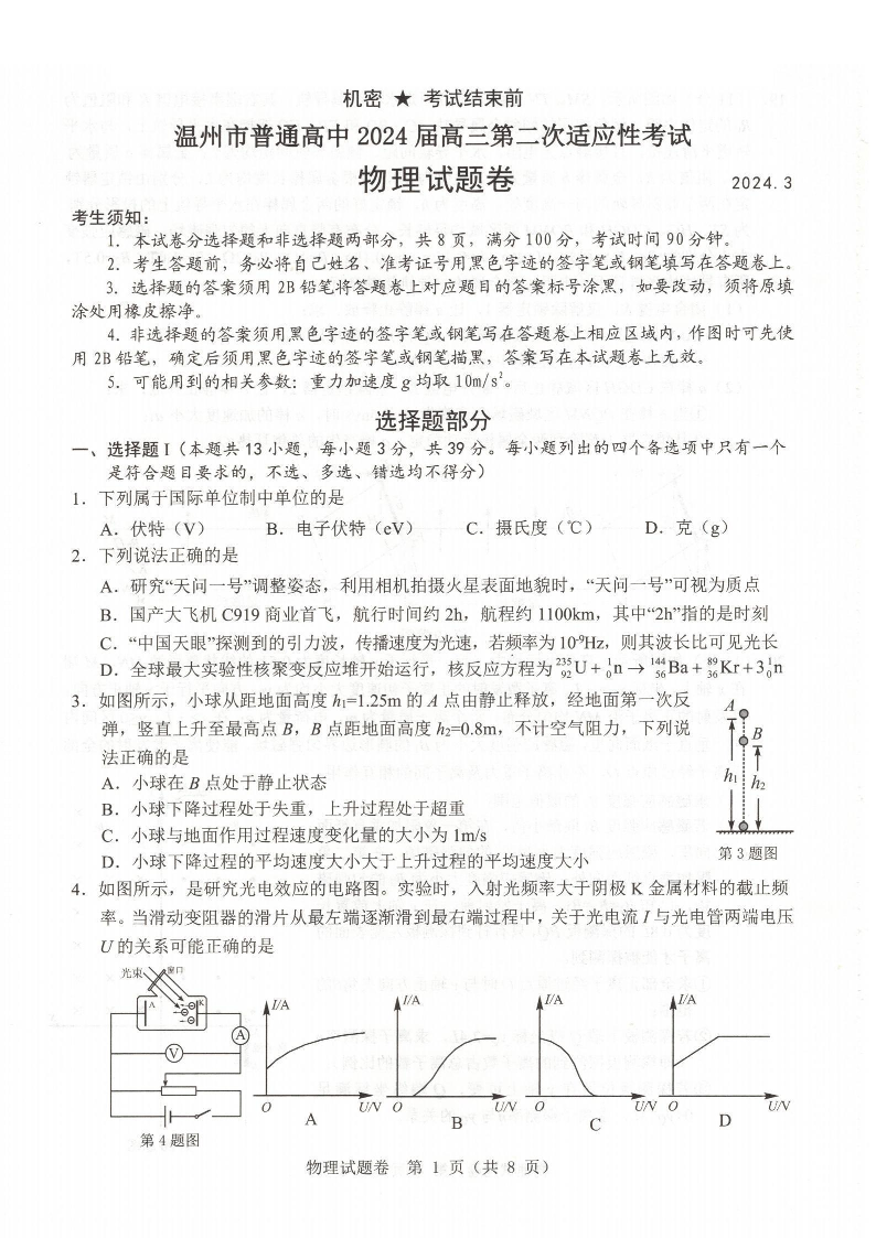 浙江省温州市普通高中2024届高三第二次适应性考试(温州二模)物理