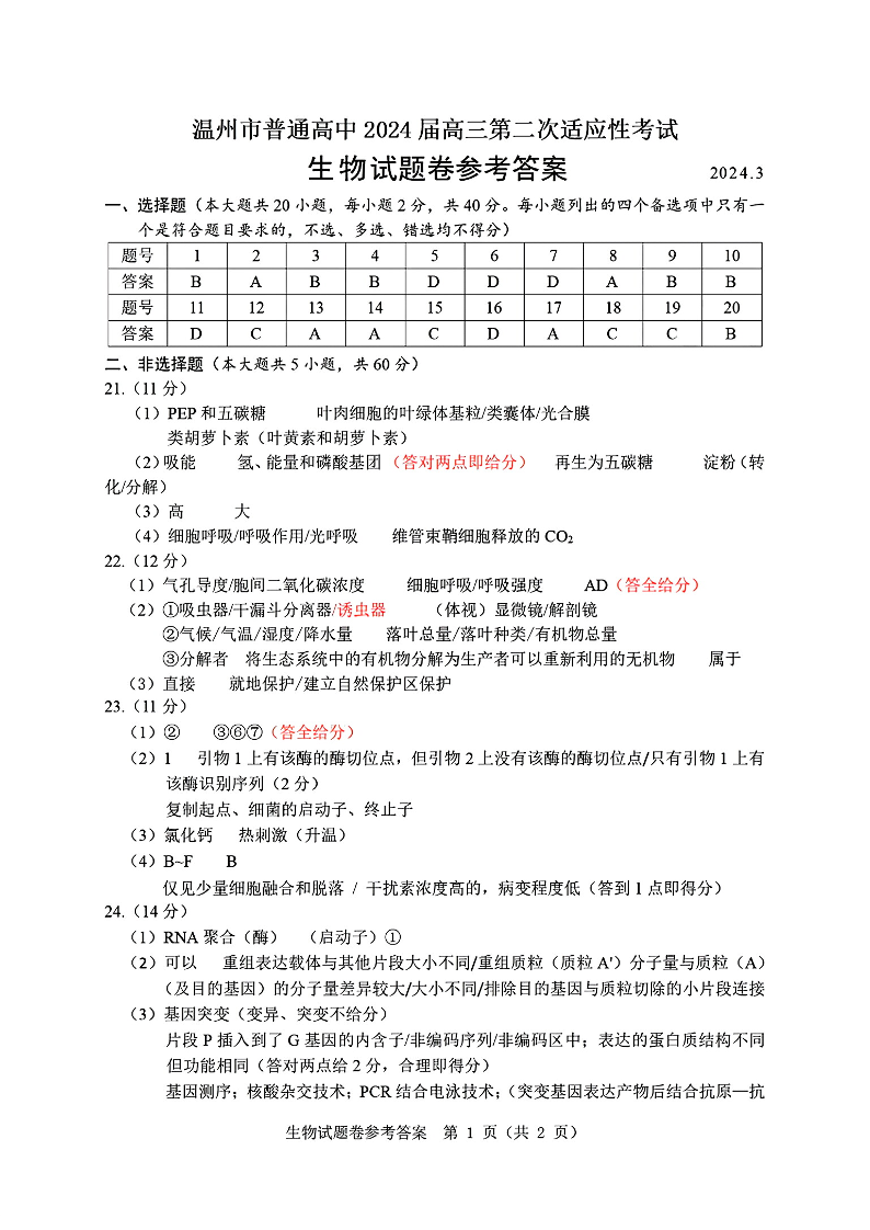 浙江省温州市普通高中2024届高三第二次适应性考试(温州二模)生物答案