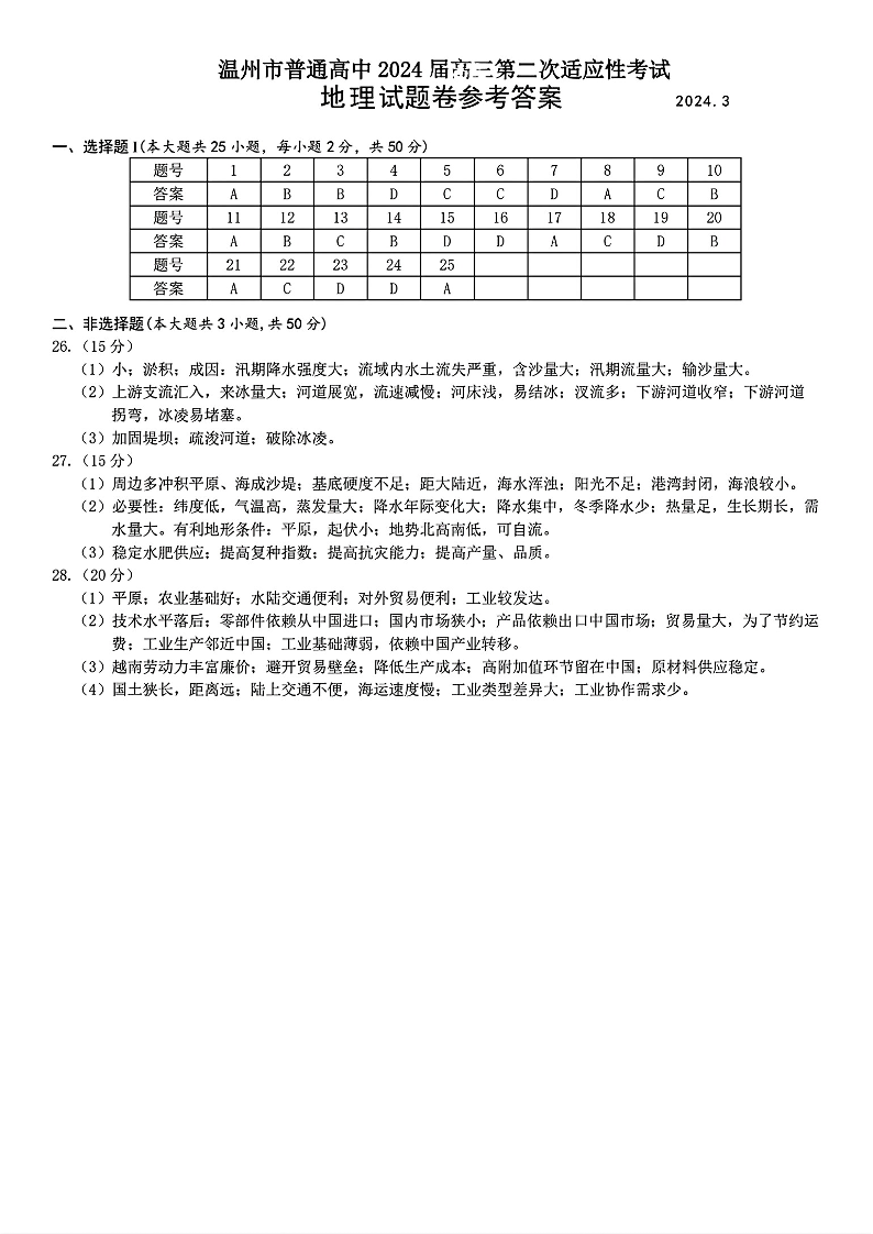 浙江省温州市普通高中2024届高三第二次适应性考试(温州二模)地理答案