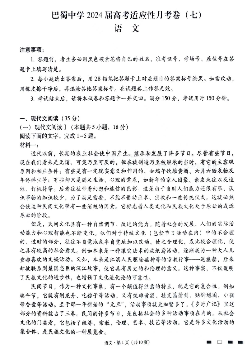 重庆市巴蜀中学2024届高考适应性月考(七)语文