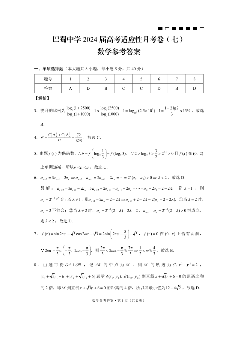重庆市巴蜀中学2024届高考适应性月考(七)数学答案