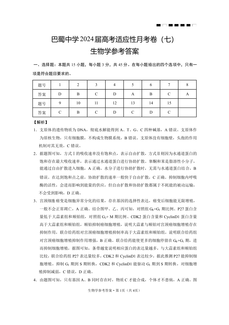 重庆市巴蜀中学2024届高考适应性月考(七)生物答案