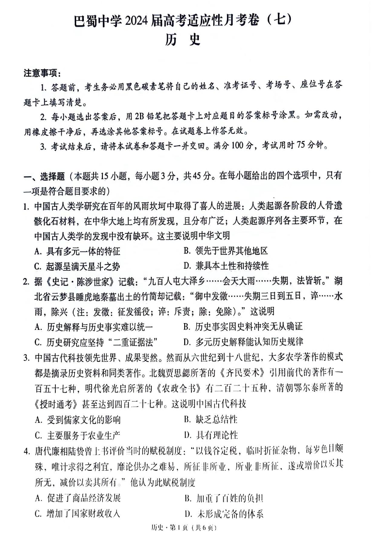 重庆市巴蜀中学2024届高考适应性月考(七)历史