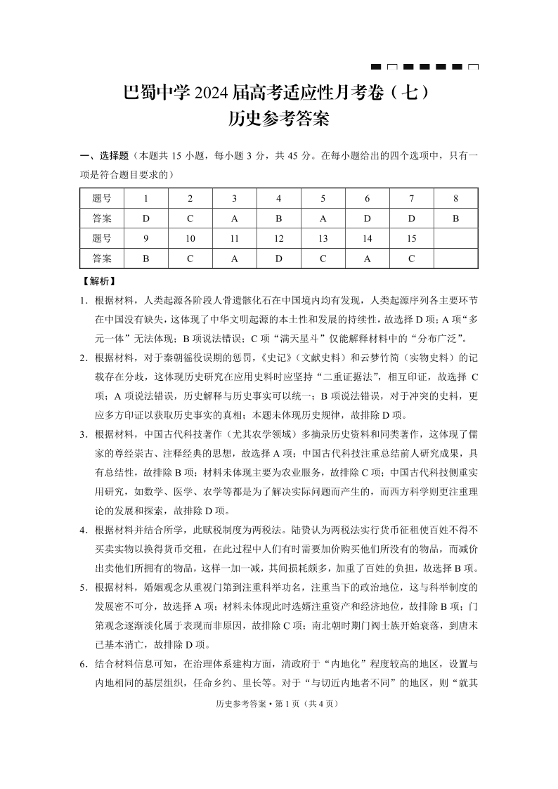 重庆市巴蜀中学2024届高考适应性月考(七)历史答案