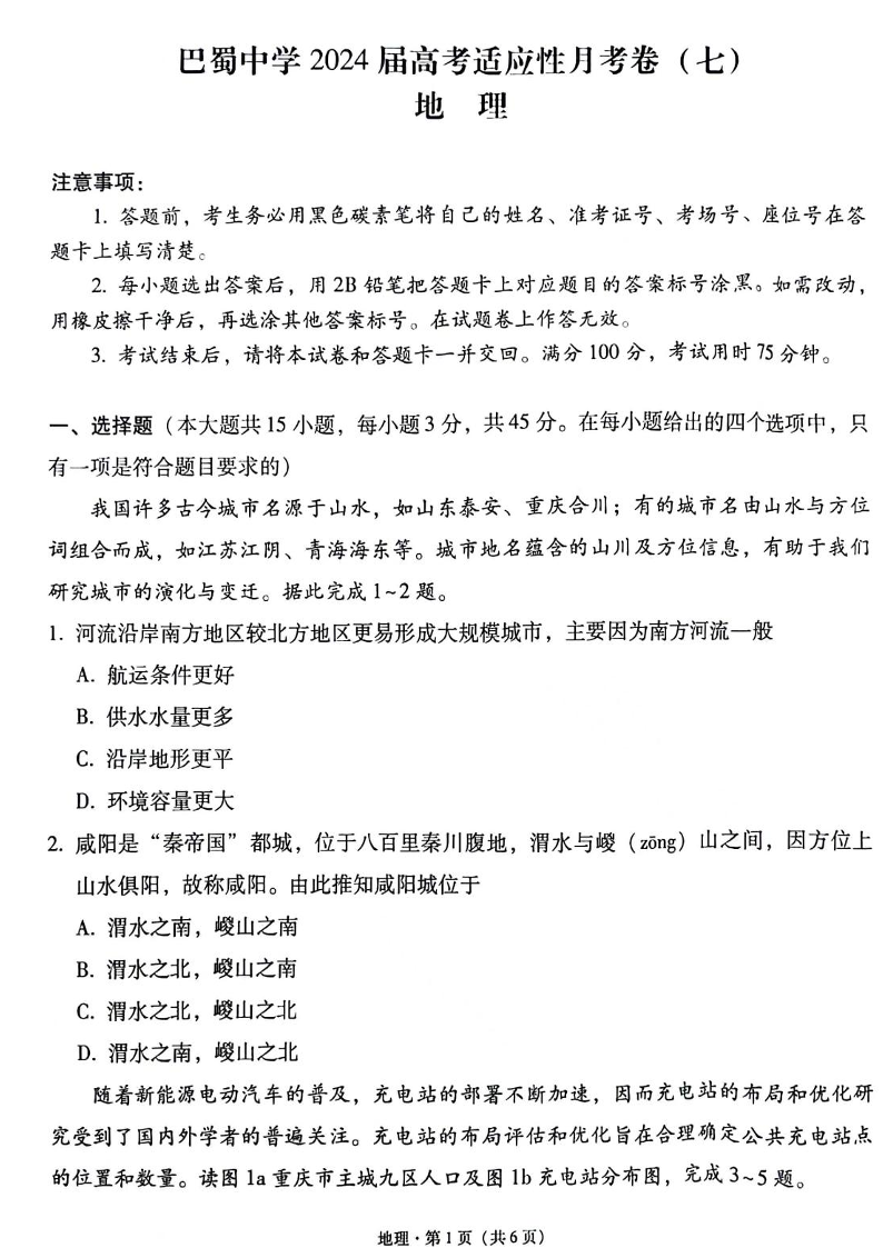 重庆市巴蜀中学2024届高考适应性月考(七)地理