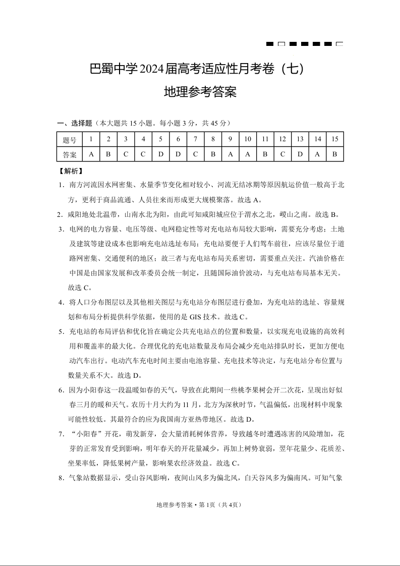 重庆市巴蜀中学2024届高考适应性月考(七)地理答案