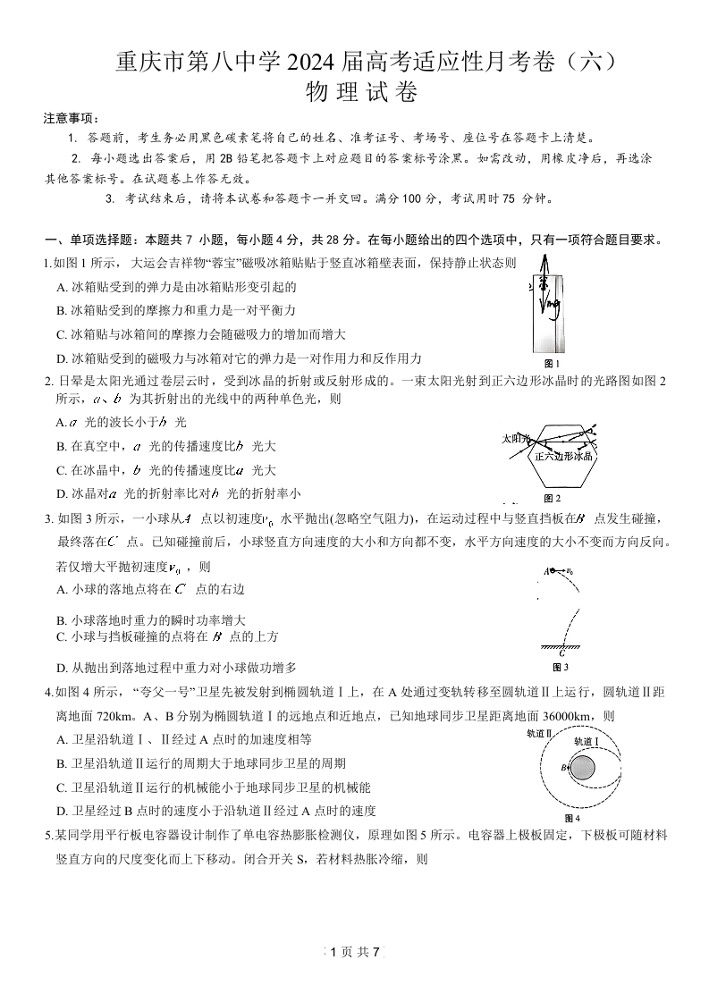 重庆市第八中学2024届高考适应性月考卷(六)物理