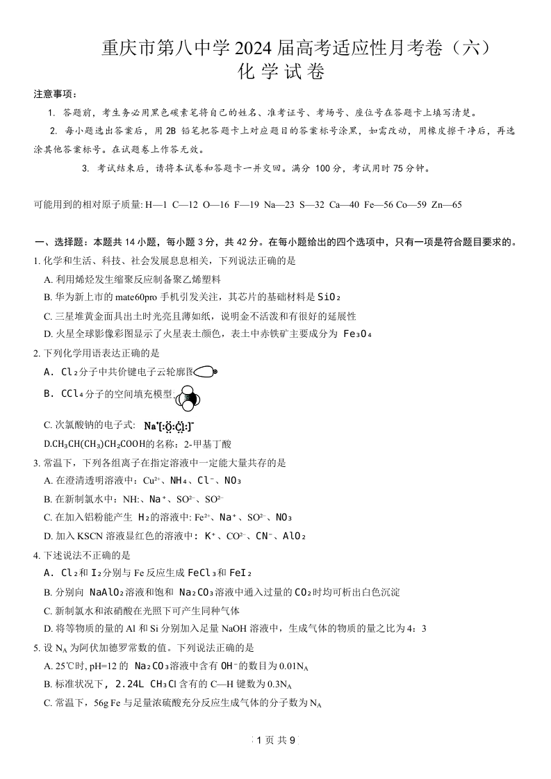 重庆市第八中学2024届高考适应性月考卷(六)化学