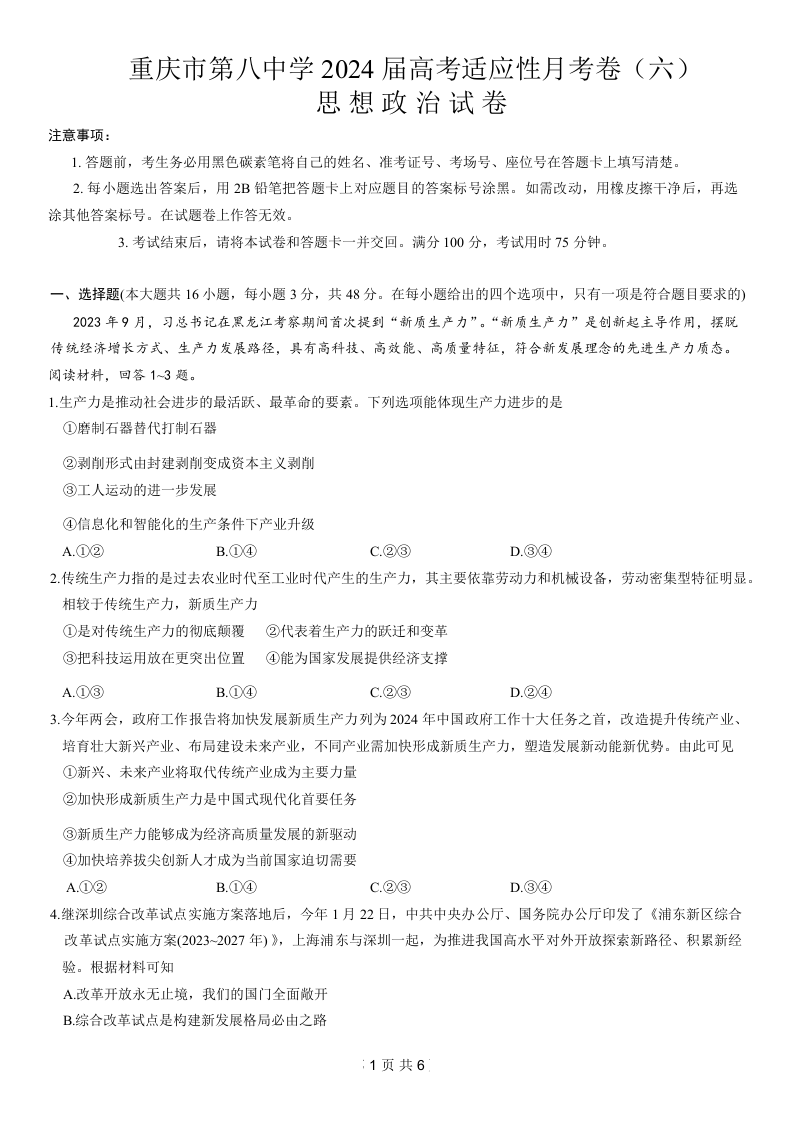 重庆市第八中学2024届高考适应性月考卷(六)政治