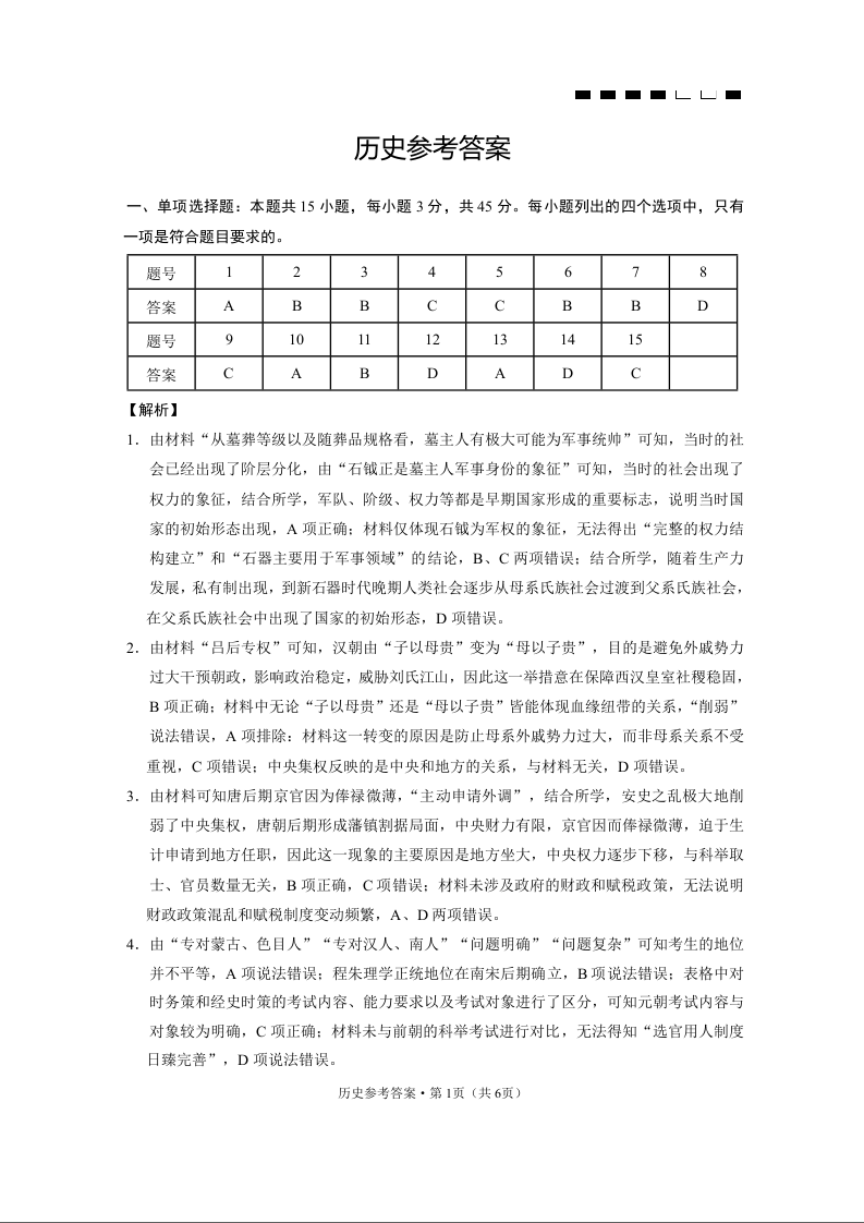 重庆市第八中学2024届高考适应性月考卷(六)历史答案