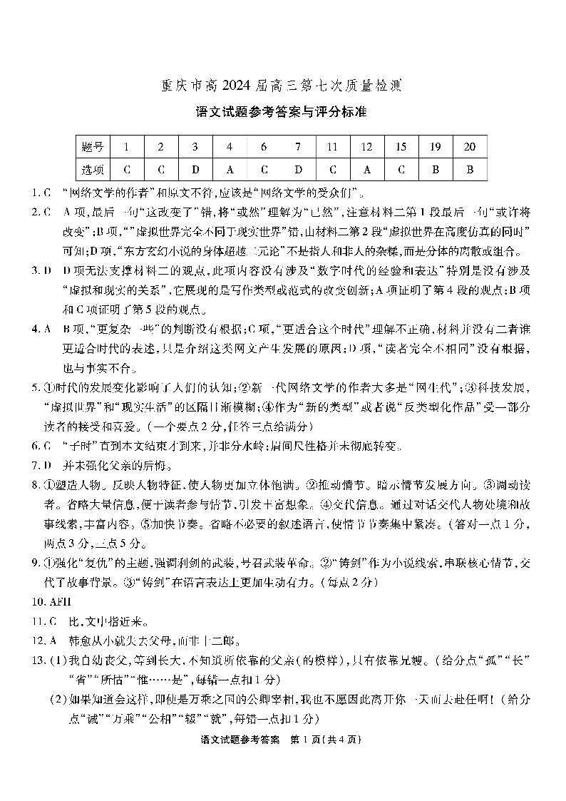 重庆市南开中学高2024届高三第七次质量检测语文答案