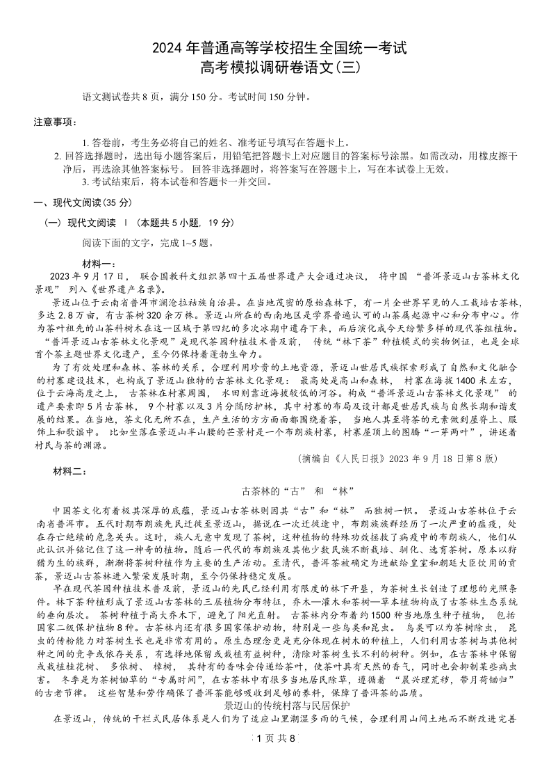 康德2024届重庆市普通高等学校招生全国统一考试高考模拟调研卷(三)语文