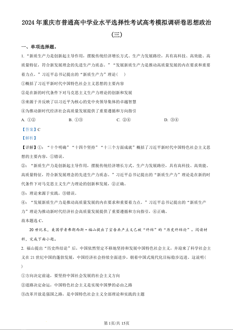 康德2024届重庆市普通高等学校招生全国统一考试高考模拟调研卷(三)政治(精品解析版)
