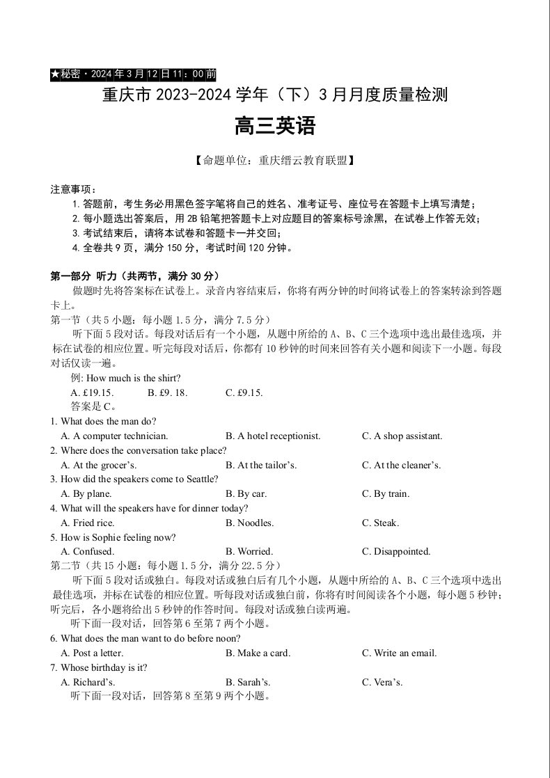 重庆市缙云教育联盟2024届高三下学期3月月考英语+答案