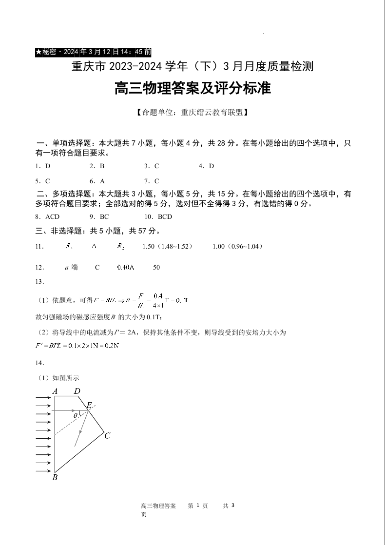 重庆市缙云教育联盟2024届高三下学期3月月考物理答案