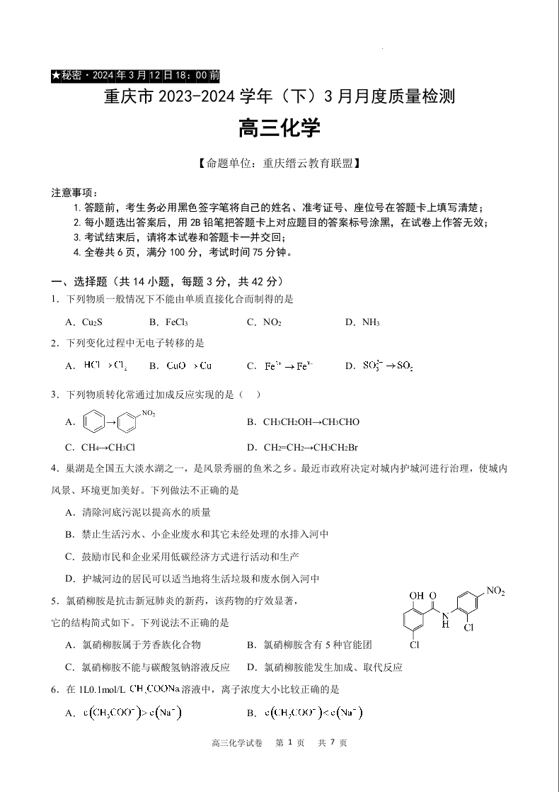 重庆市缙云教育联盟2024届高三下学期3月月考化学