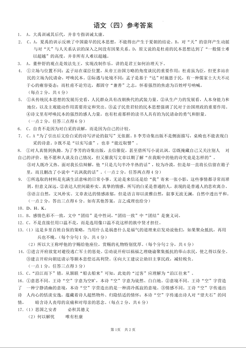 重庆市康德卷2024年普通高等学校招生全国统一考试高考模拟调研卷(四)语文答案