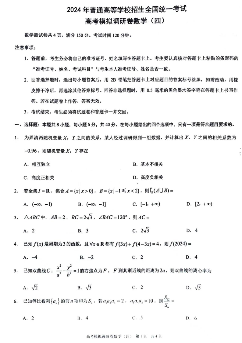 重庆市康德卷2024年普通高等学校招生全国统一考试高考模拟调研卷(四)数学
