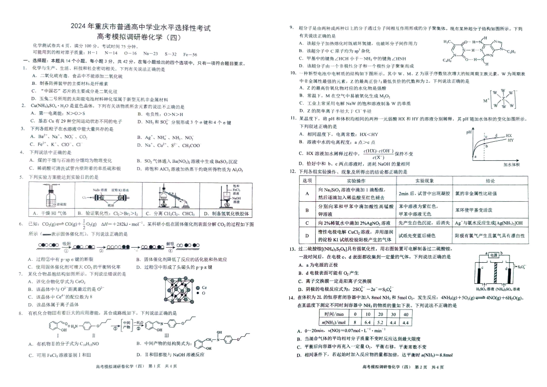 重庆市康德卷2024年普通高等学校招生全国统一考试高考模拟调研卷(四)化学