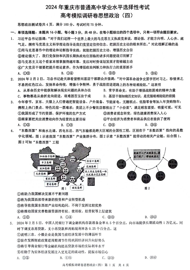 重庆市康德卷2024年普通高等学校招生全国统一考试高考模拟调研卷(四)政治