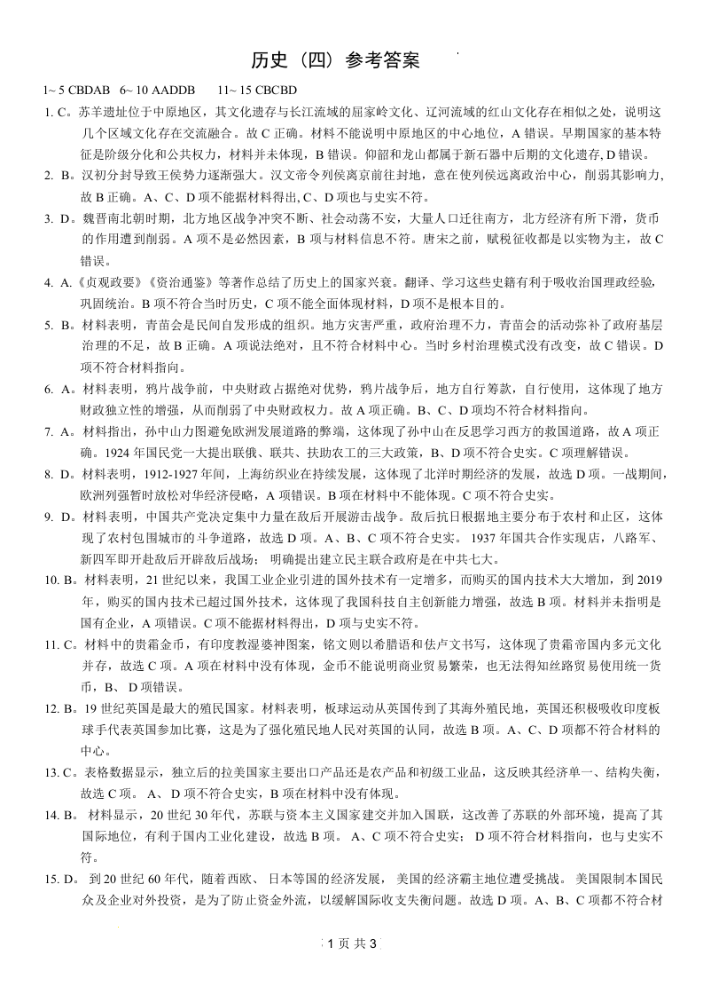 重庆市康德卷2024年普通高等学校招生全国统一考试高考模拟调研卷(四)历史答案