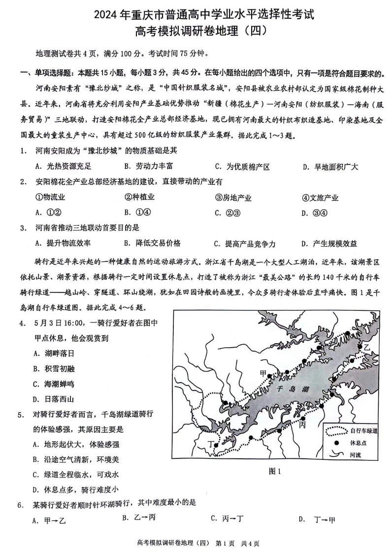 重庆市康德卷2024年普通高等学校招生全国统一考试高考模拟调研卷(四)地理