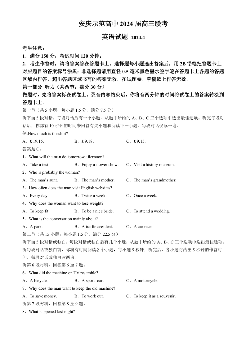 安徽省2024届安庆示范高中高三下学期4月联考(三模)英语+答案