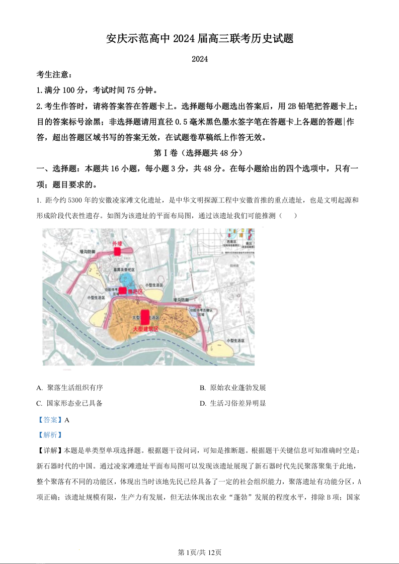 安徽省2024届安庆示范高中高三下学期4月联考(三模)历史(精品解析版)