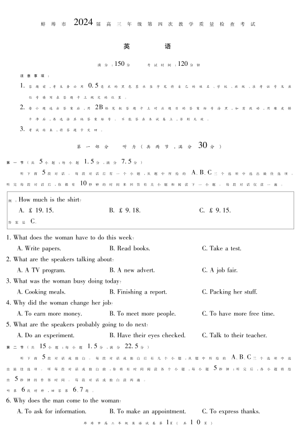 安徽省蚌埠市2024届高三下学期第四次教学质量检测考试(蚌埠四模滁州二模)英语