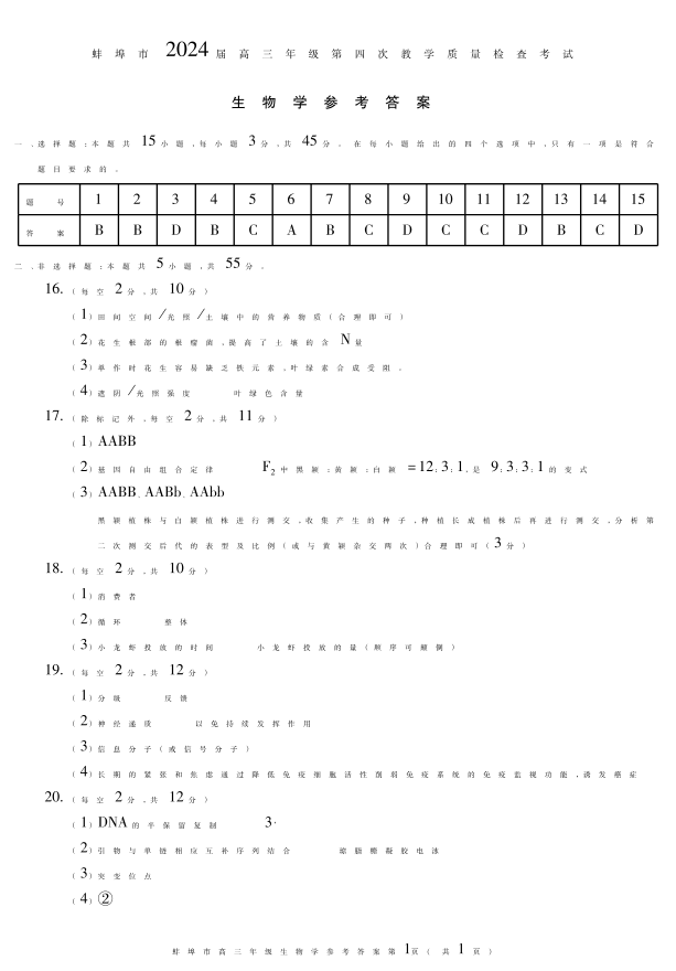 安徽省蚌埠市2024届高三下学期第四次教学质量检测考试(蚌埠四模滁州二模)生物答案