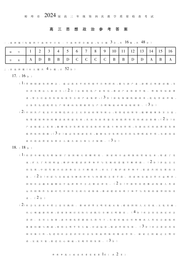 安徽省蚌埠市2024届高三下学期第四次教学质量检测考试(蚌埠四模滁州二模)政治答案