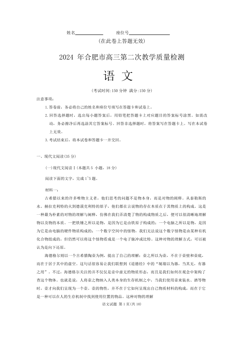 安徽省合肥市2024届高三第二次教学质量检测(合肥二模)语文