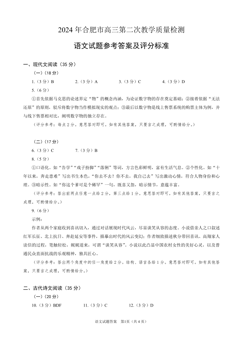 安徽省合肥市2024届高三第二次教学质量检测(合肥二模)语文答案