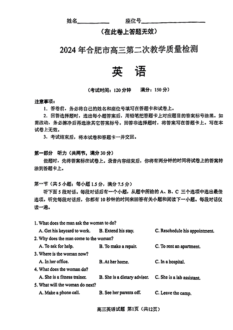 安徽省合肥市2024届高三第二次教学质量检测(合肥二模)英语