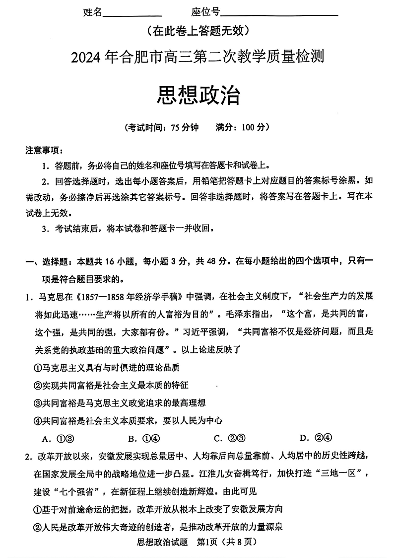 安徽省合肥市2024届高三第二次教学质量检测(合肥二模)政治