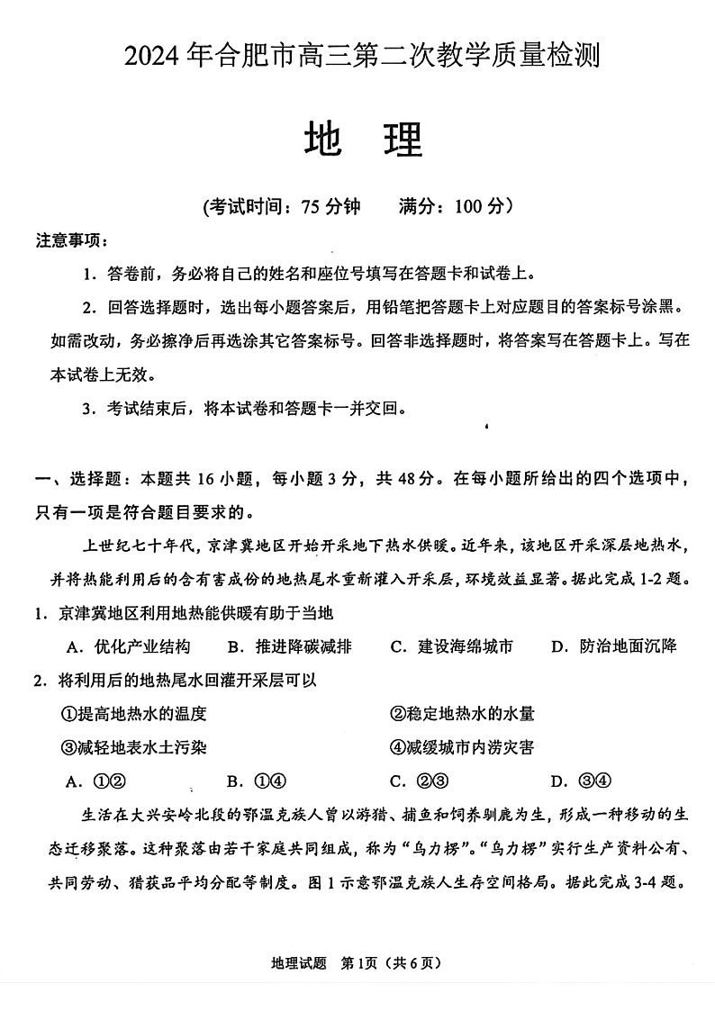 安徽省合肥市2024届高三第二次教学质量检测(合肥二模)地理