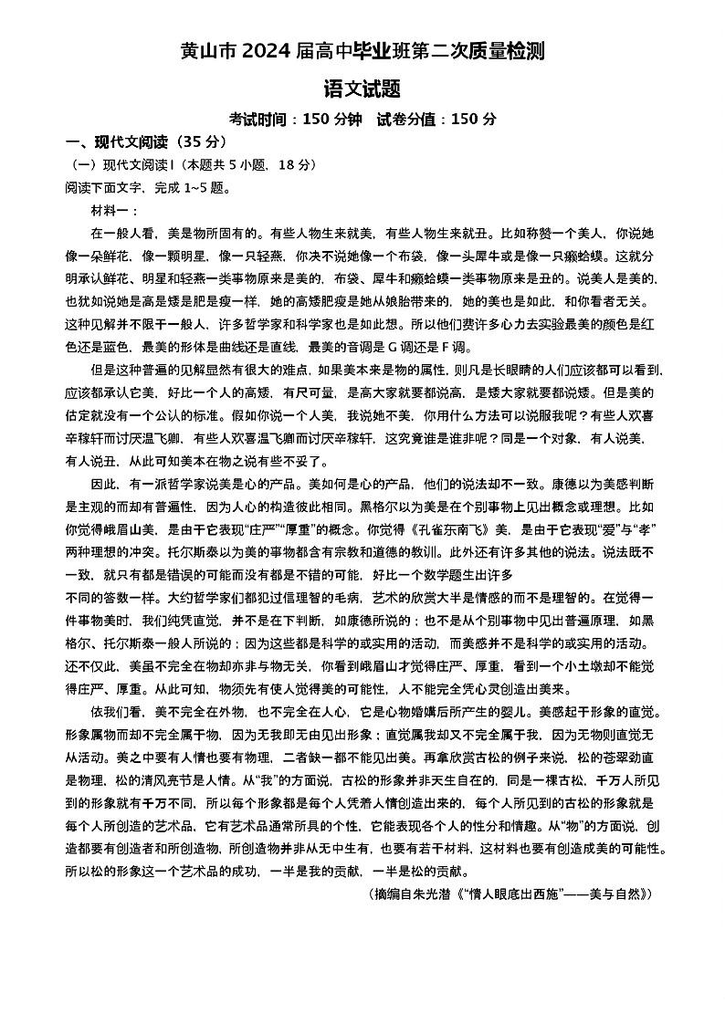 安徽省黄山市、宣城市2024届高三下学期第二次质量检测试题(黄山宣城二模)语文+答案