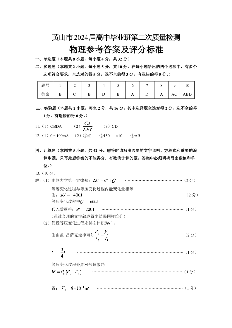 安徽省黄山市、宣城市2024届高三下学期第二次质量检测试题(黄山宣城二模)物理答案