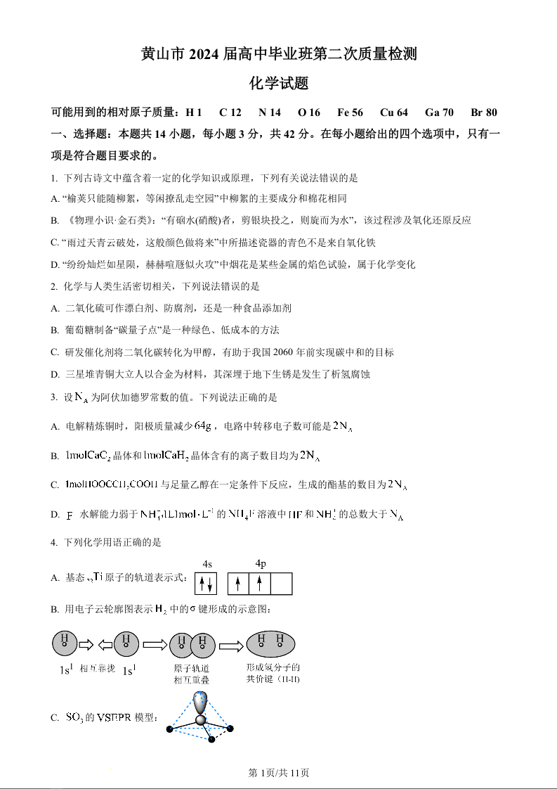 安徽省黄山市、宣城市2024届高三下学期第二次质量检测试题(黄山宣城二模)化学(原卷版)