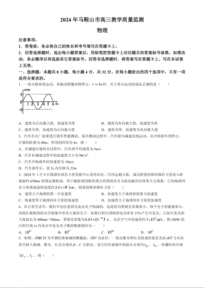 安徽省马鞍山市2024届高三下学期三模物理+答案
