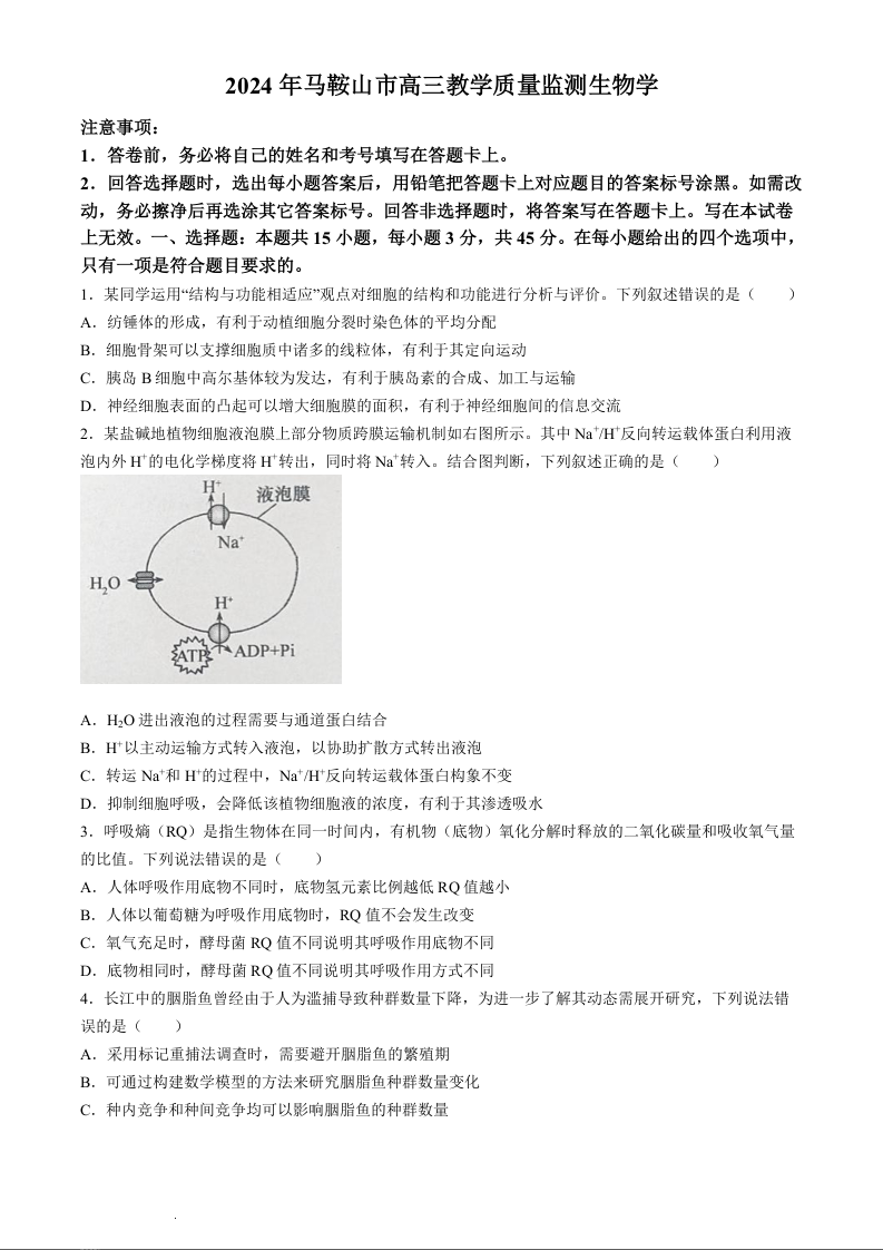 安徽省马鞍山市2024届高三下学期三模生物+答案