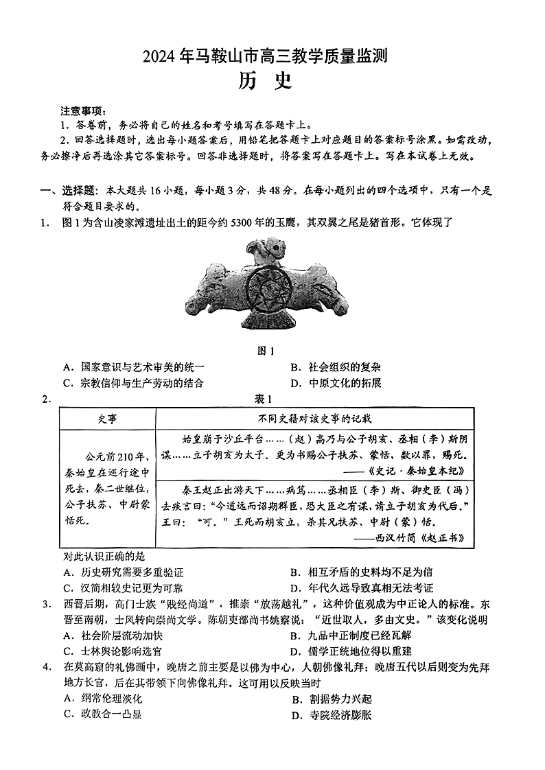 安徽省马鞍山市2024届高三下学期三模历史+答案