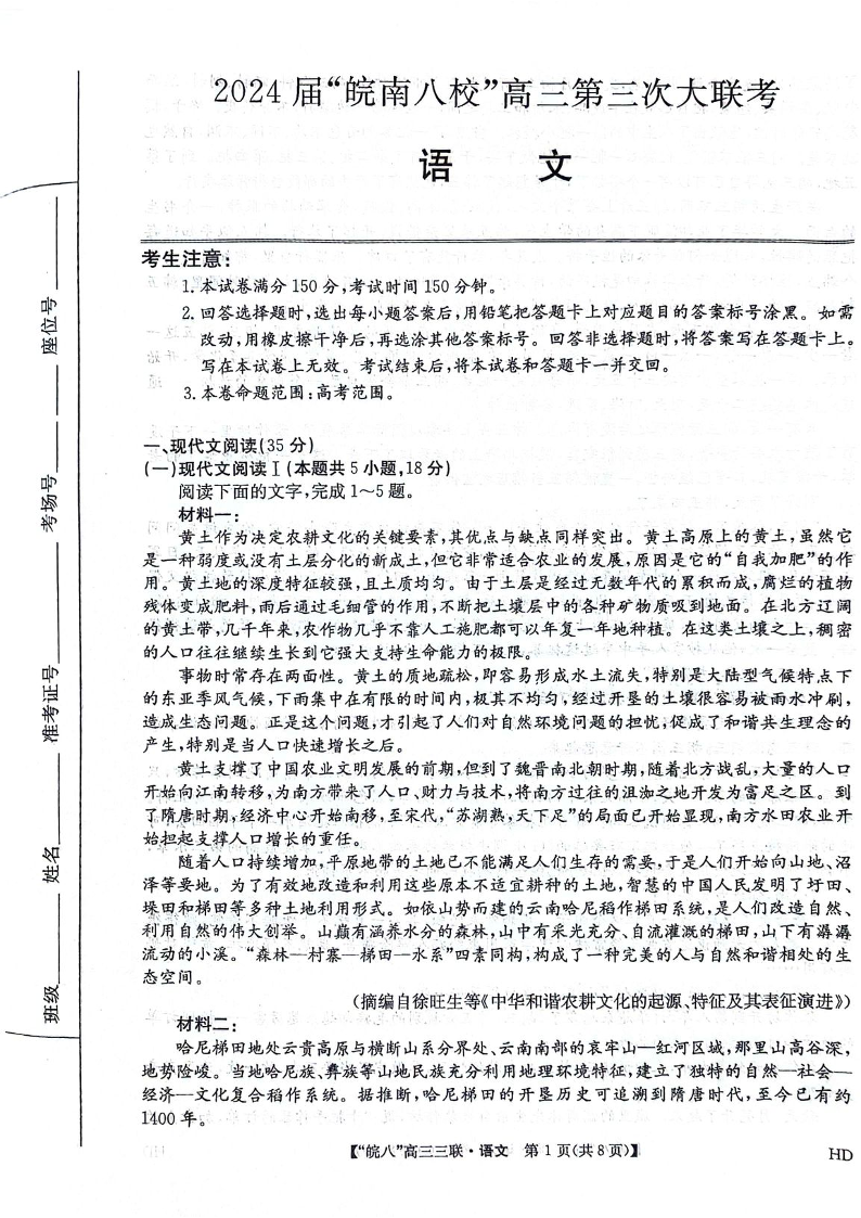 安徽省皖南八校2024届高三下学期4月第三次联考语文
