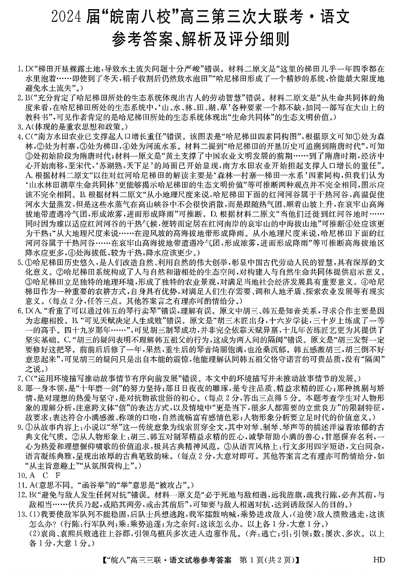 安徽省皖南八校2024届高三下学期4月第三次联考语文答案