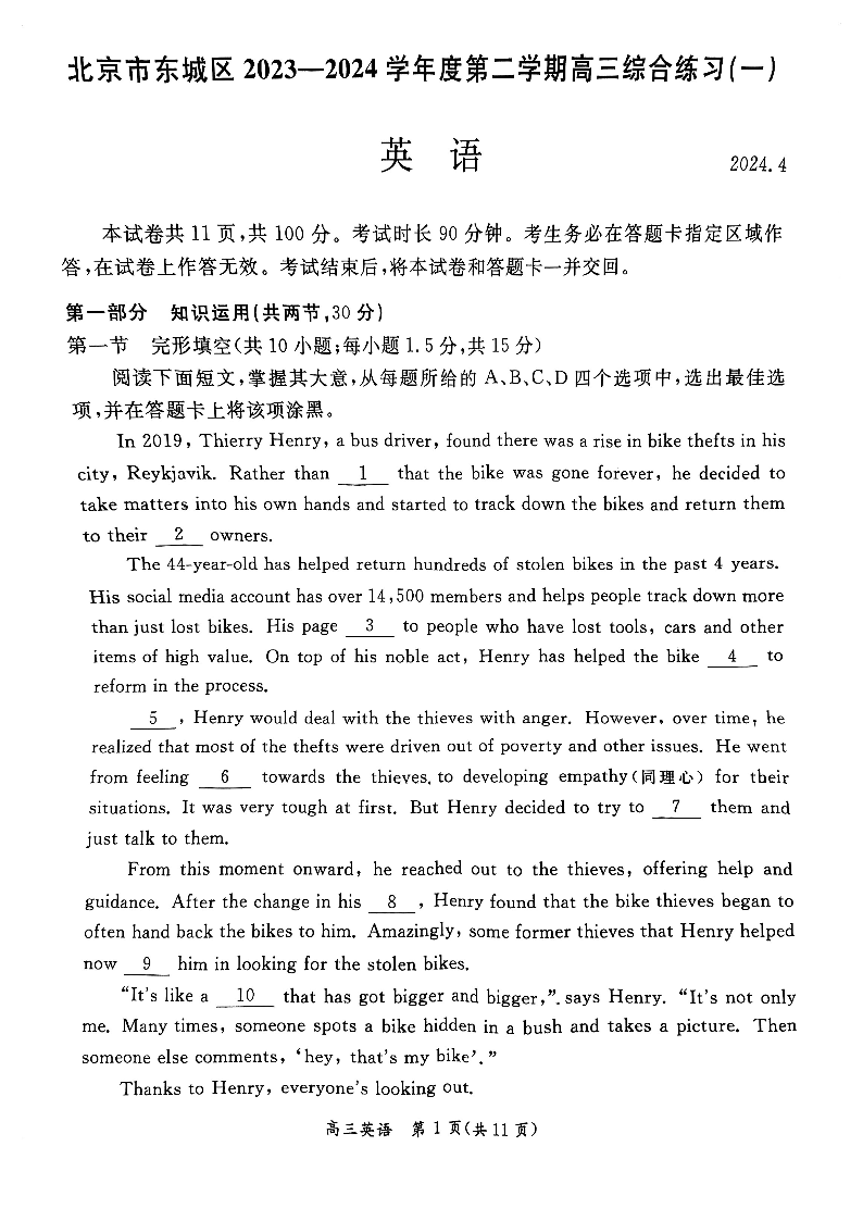 北京市东城区2024届度第二学期高三综合练习(一)英语+答案