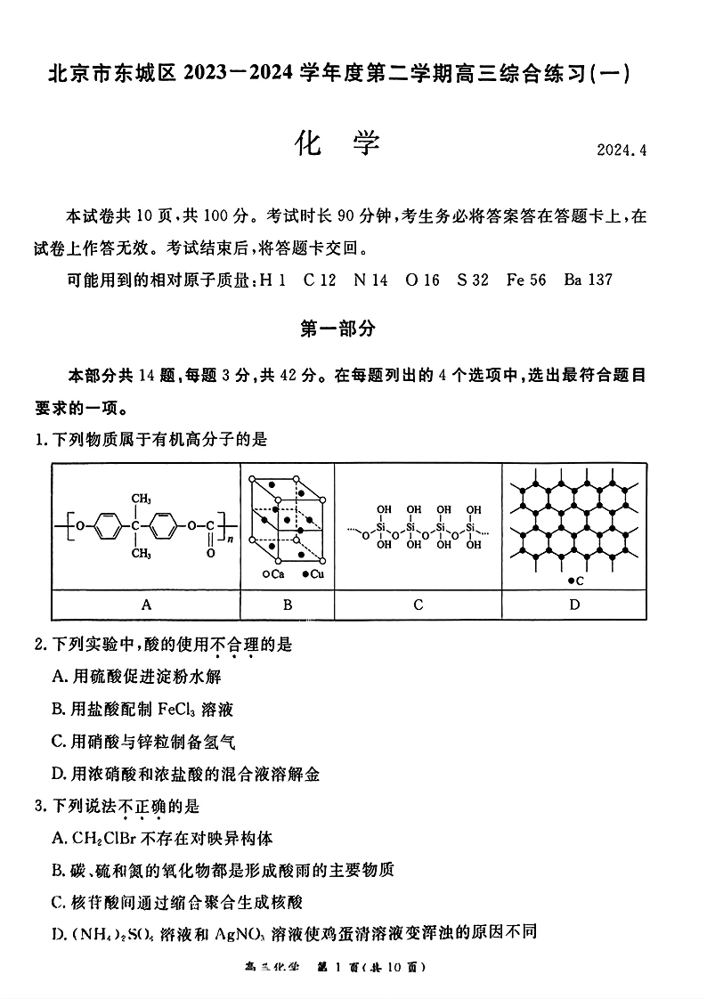 北京市东城区2024届度第二学期高三综合练习(一)化学+答案